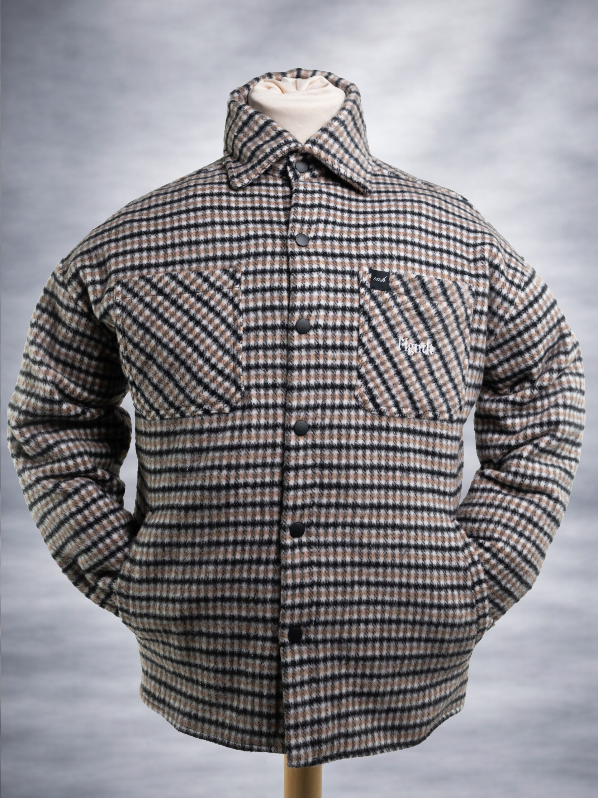 Die CMH x TLT Flanell Jacket in Braun wird aus feinstem gebürsteten Pepita-Stoff gefertigt